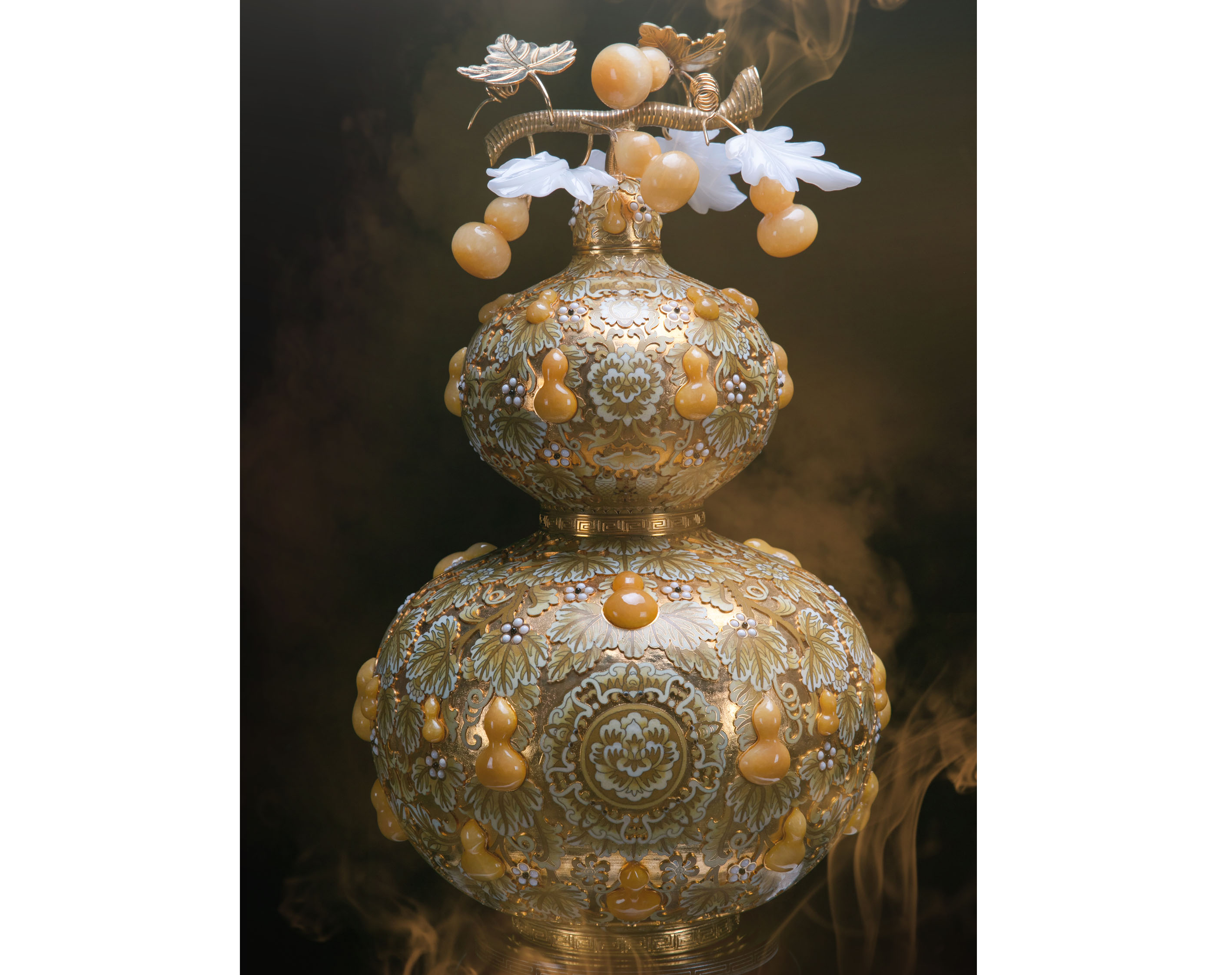 此臻品高56公分,宽约30公分。其造型以万代葫芦为主体,其花纹为五福捧花吉庆有鱼。周身为万代葫芦纹缠绕全身。其色以黄色为主色调,天然矿物质珐琅釉料渐变配色。其工艺采用景泰蓝金地葫芦展示。周身有黄玉精制的41个葫芦嵌制,并有用精制的白珊瑚225粒圆点及45个黑玛瑙圆石组成了45朵葫芦花嵌制全身,又用黄玉、阿富汗白玉精制的葫芦和叶子嵌制上端,更彰显此珍品生动逼真。此珍品总体感为高雅华贵、富丽堂皇、玲珑剔透,具有浓郁的皇家气势,珍品寓意:万代富贵吉祥照,必有鸿运降人间,此珍品是当代空前收藏珍品。